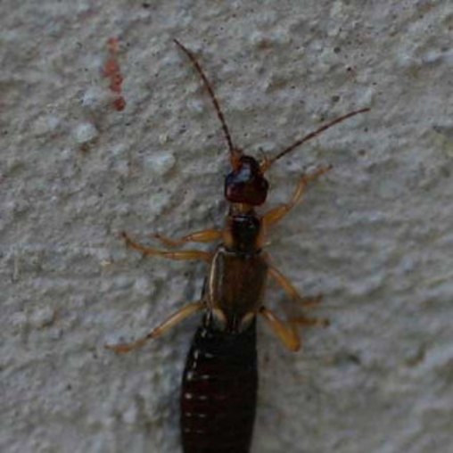 Adult earwigs are flattened insects, up to 1-1/4 inches long. Their color ranges from red-brown to black. They are active at night and scavenge on dead insects and plant materials. During the day they hide under stones, boards, sidewalks, or debris.