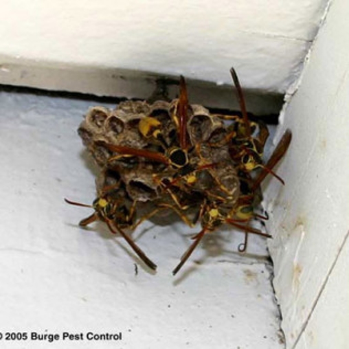 Paper wasps are common around most homes in the Bay Area. They are a slender wasps about 1 inch long with long legs and a tiny waist. Their colors can vary from golden brown or darker with large patches of yellow or red.