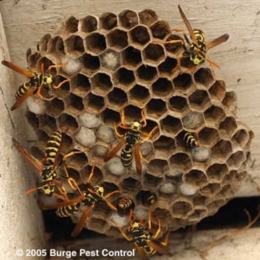 Paper wasps build these paper umbrella-like nests under any protected area, such as under eves, in attics, under fence rails or inside sheds. There can be several colonies near each other.